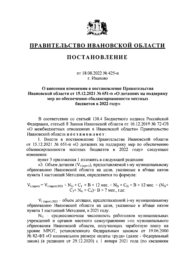 Постановление Правительства Ивановской области от 18.08.2022 N 425-п "О внесении изменения в постановление Правительства Ивановской области от 15.12.2021 N 651-п "О дотациях на поддержку мер по обеспечению сбалансированности местных бюджетов в 2022 году"