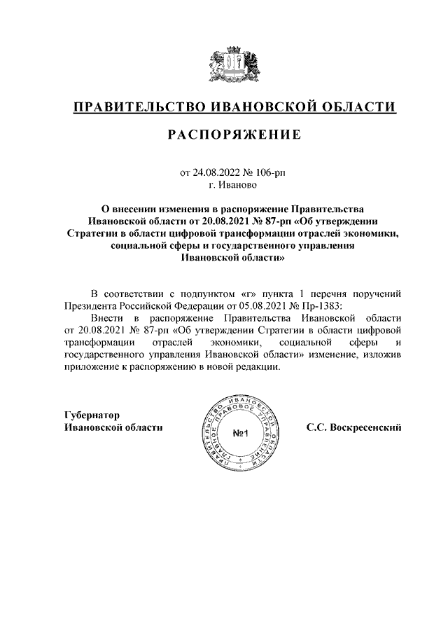 Распоряжение Правительства Ивановской области от 24.08.2022 N 106-рп "О внесении изменения в распоряжение Правительства Ивановской области от 20.08.2021 N 87-рп "Об утверждении Стратегии в области цифровой трансформации отраслей экономики, социальной сферы и государственного управления Ивановской области"