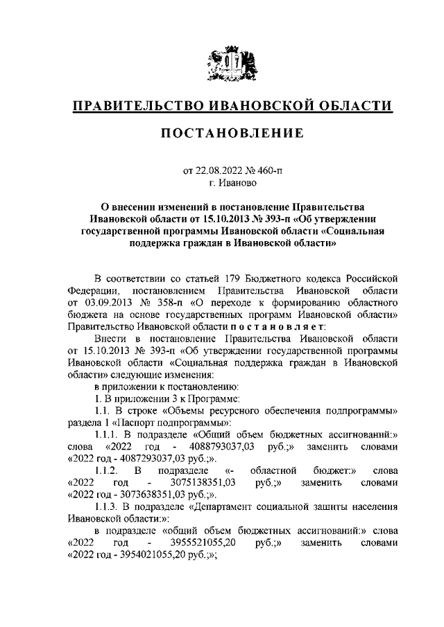 Постановление Правительства Ивановской области от 22.08.2022 N 460-п "О внесении изменений в постановление Правительства Ивановской области от 15.10.2013 N 393-п "Об утверждении государственной программы Ивановской области "Социальная поддержка граждан в Ивановской области"