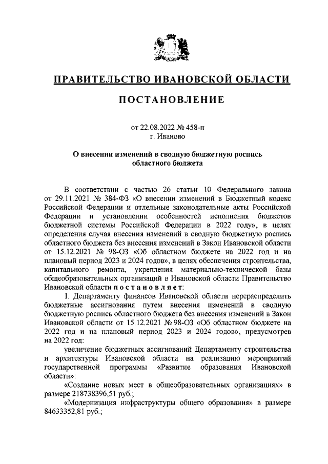 Постановление Правительства Ивановской области от 22.08.2022 N 458-п "О внесении изменений в сводную бюджетную роспись областного бюджета"