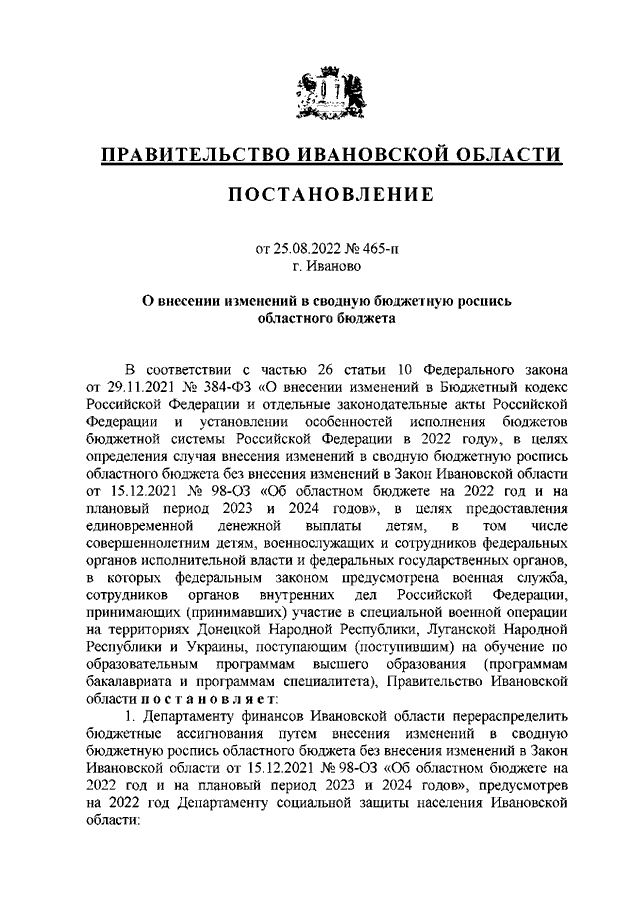 Постановление Правительства Ивановской области от 25.08.2022 N 465-п "О внесении изменений в сводную бюджетную роспись областного бюджета"