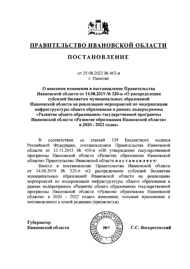Постановление Правительства Ивановской области от 25.08.2022 N 463-п "О внесении изменения в постановление Правительства Ивановской области от 14.08.2019 N 320-п "О распределении субсидий бюджетам муниципальных образований Ивановской области на реализацию мероприятий по модернизации инфраструктуры общего образования в рамках подпрограммы "Развитие общего образования" государственной программы Ивановской области "Развитие образования Ивановской области" в 2020 - 2022 годах"