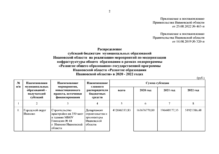 Постановление Правительства Ивановской области от 25.08.2022 N 463-п "О внесении изменения в постановление Правительства Ивановской области от 14.08.2019 N 320-п "О распределении субсидий бюджетам муниципальных образований Ивановской области на реализацию мероприятий по модернизации инфраструктуры общего образования в рамках подпрограммы "Развитие общего образования" государственной программы Ивановской области "Развитие образования Ивановской области" в 2020 - 2022 годах"