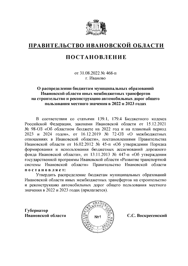 Постановление Правительства Ивановской области от 31.08.2022 N 468-п "О распределении бюджетам муниципальных образований Ивановской области иных межбюджетных трансфертов на строительство и реконструкцию автомобильных дорог общего пользования местного значения в 2022 и 2023 годах"