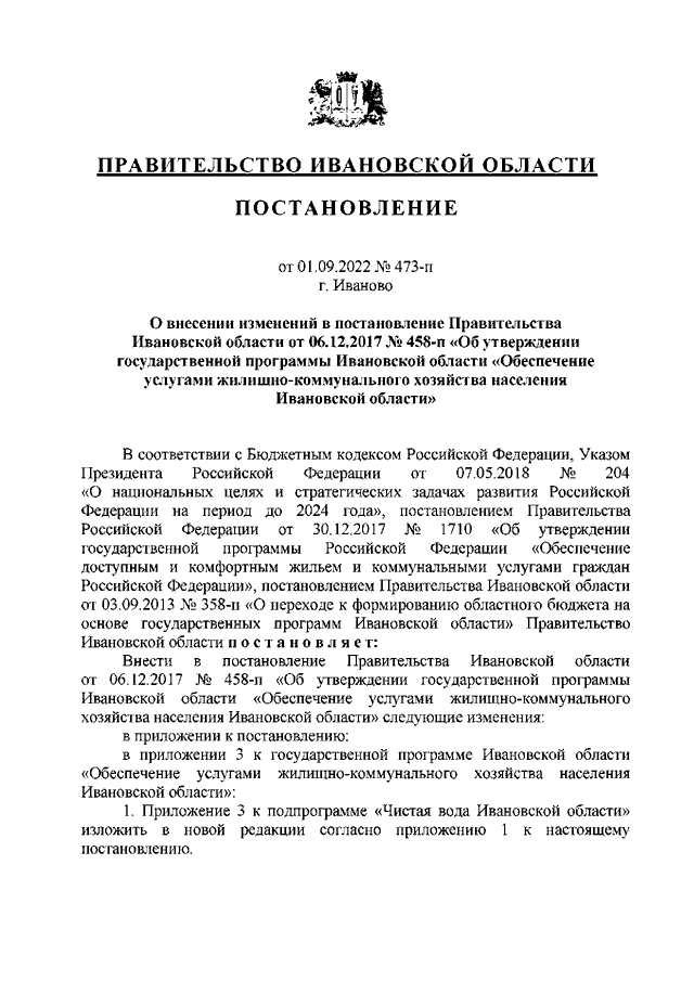 Постановление Правительства Ивановской области от 01.09.2022 N 473-п "О внесении изменений в постановление Правительства Ивановской области от 06.12.2017 N 458-п "Об утверждении государственной программы Ивановской области "Обеспечение услугами жилищно-коммунального хозяйства населения Ивановской области"