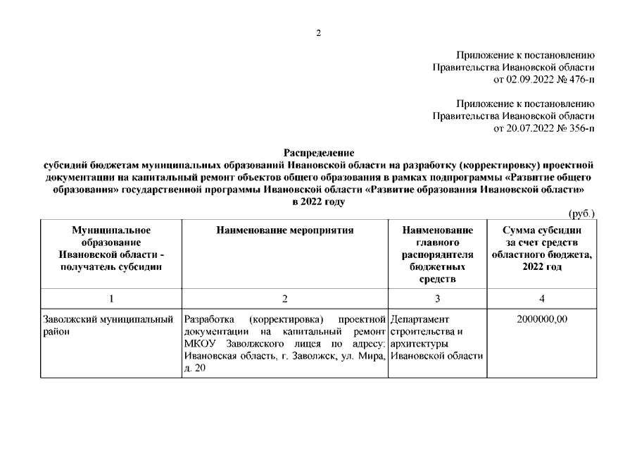 Постановление Правительства Ивановской области от 02.09.2022 N 476-п "О внесении изменения в постановление Правительства Ивановской области от 20.07.2022 N 356-п "О распределении субсидий бюджетам муниципальных образований Ивановской области на разработку (корректировку) проектной документации на капитальный ремонт объектов общего образования в рамках подпрограммы "Развитие общего образования" государственной программы Ивановской области "Развитие образования Ивановской области" в 2022 году"