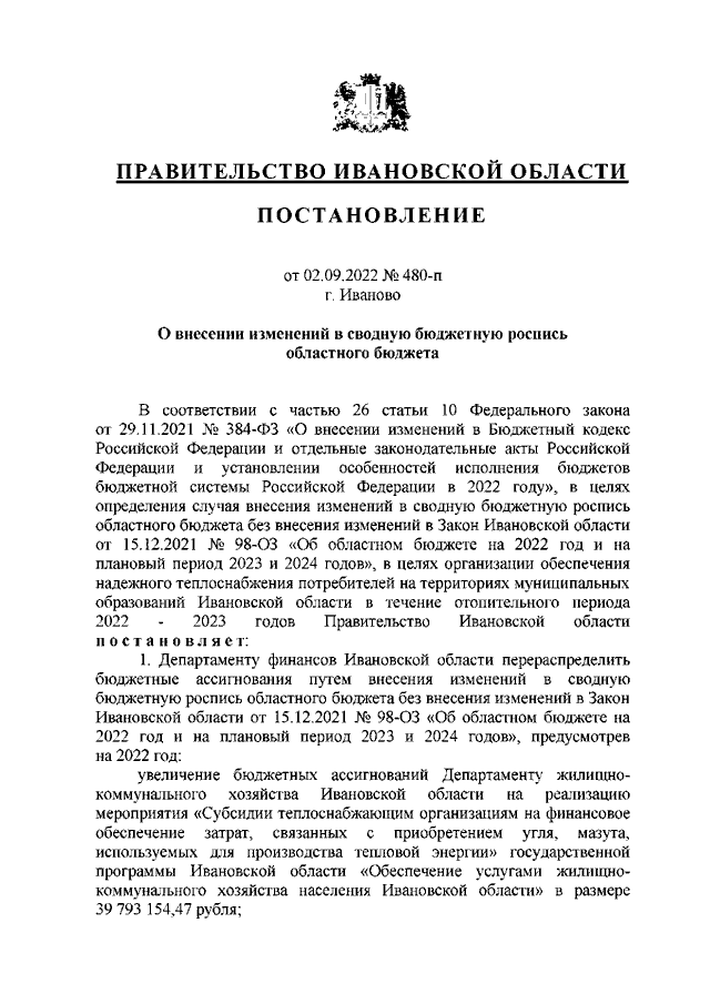 Постановление Правительства Ивановской области от 02.09.2022 N 480-п "О внесении изменений в сводную бюджетную роспись областного бюджета"
