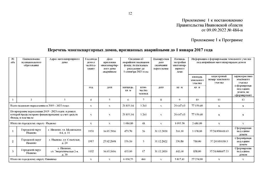 Постановление Правительства Ивановской области от 09.09.2022 N 484-п "О внесении изменений в постановление Правительства Ивановской области от 09.04.2019 N 131-п "Об утверждении региональной адресной программы "Переселение граждан из аварийного жилищного фонда на территории Ивановской области на 2019 - 2023 годы" (вместе с "Перечнем многоквартирных домов, признанных аварийными до 1 января 2017 года", "Планом реализации мероприятий по переселению граждан из аварийного жилищного фонда, признанного таковым до 1 января 2017 года, по способам переселения")