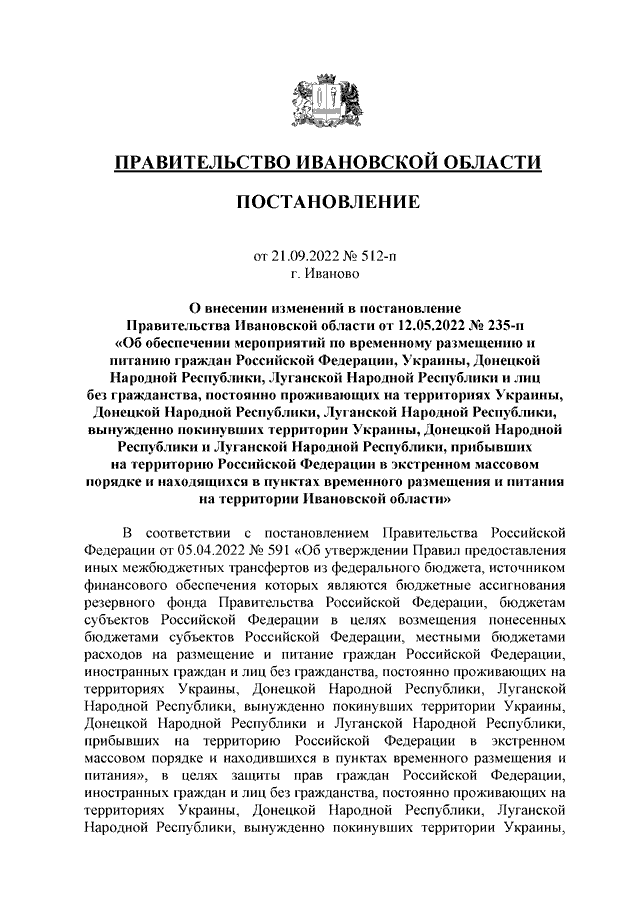 Постановление Правительства Ивановской области от 21.09.2022 N 512-п "О внесении изменений в постановление Правительства Ивановской области от 12.05.2022 N 235-п "Об обеспечении мероприятий по временному размещению и питанию граждан Российской Федерации, Украины, Донецкой Народной Республики, Луганской Народной Республики и лиц без гражданства, постоянно проживающих на территориях Украины, Донецкой Народной Республики, Луганской Народной Республики, вынужденно покинувших территории Украины, Донецкой Народной Республики и Луганской Народной Республики, прибывших на территорию Российской Федерации в экстренном массовом порядке и находящихся в пунктах временного размещения и питания на территории Ивановской области"