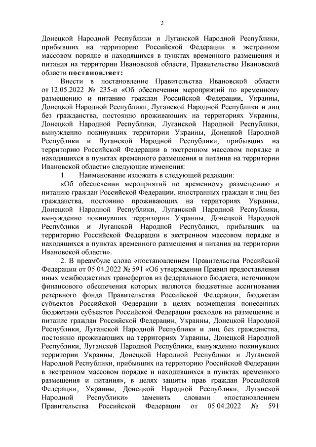 Постановление Правительства Ивановской области от 21.09.2022 N 512-п "О внесении изменений в постановление Правительства Ивановской области от 12.05.2022 N 235-п "Об обеспечении мероприятий по временному размещению и питанию граждан Российской Федерации, Украины, Донецкой Народной Республики, Луганской Народной Республики и лиц без гражданства, постоянно проживающих на территориях Украины, Донецкой Народной Республики, Луганской Народной Республики, вынужденно покинувших территории Украины, Донецкой Народной Республики и Луганской Народной Республики, прибывших на территорию Российской Федерации в экстренном массовом порядке и находящихся в пунктах временного размещения и питания на территории Ивановской области"