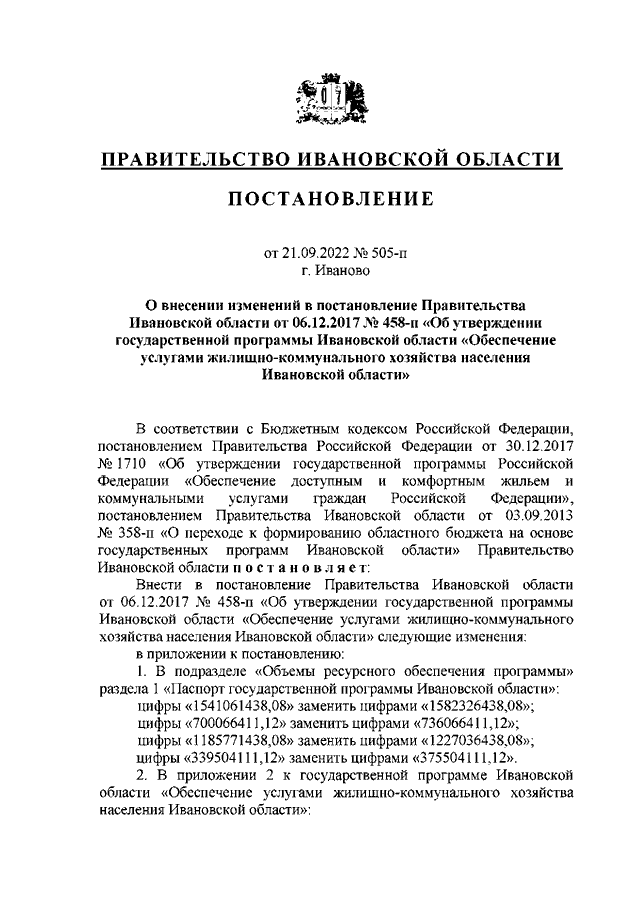 Постановление Правительства Ивановской области от 21.09.2022 N 505-п "О внесении изменений в постановление Правительства Ивановской области от 06.12.2017 N 458-п "Об утверждении государственной программы Ивановской области "Обеспечение услугами жилищно-коммунального хозяйства населения Ивановской области"