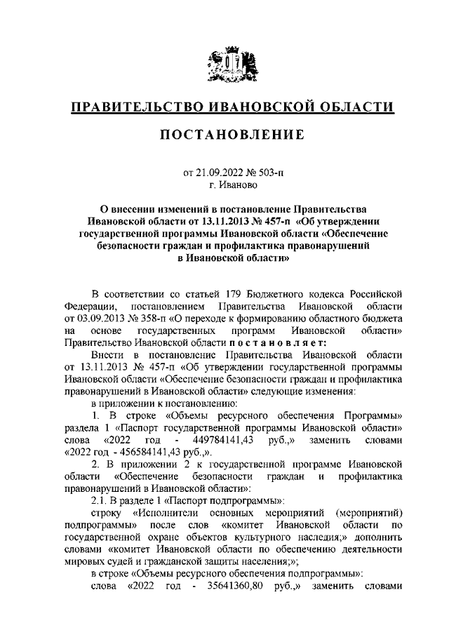 Постановление Правительства Ивановской области от 21.09.2022 N 503-п "О внесении изменений в постановление Правительства Ивановской области от 13.11.2013 N 457-п "Об утверждении государственной программы Ивановской области "Обеспечение безопасности граждан и профилактика правонарушений в Ивановской области"