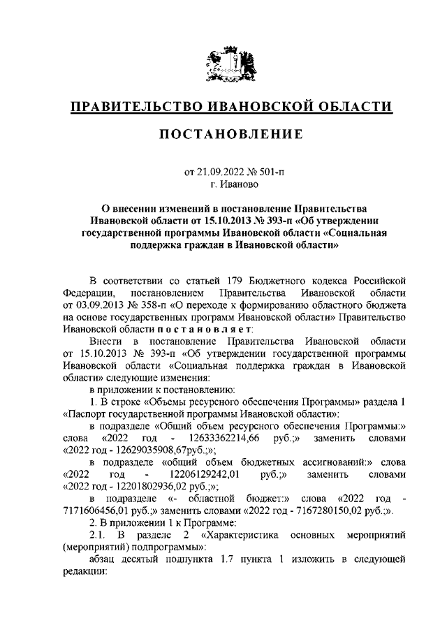 Постановление Правительства Ивановской области от 21.09.2022 N 501-п "О внесении изменений в постановление Правительства Ивановской области от 15.10.2013 N 393-п "Об утверждении государственной программы Ивановской области "Социальная поддержка граждан в Ивановской области"