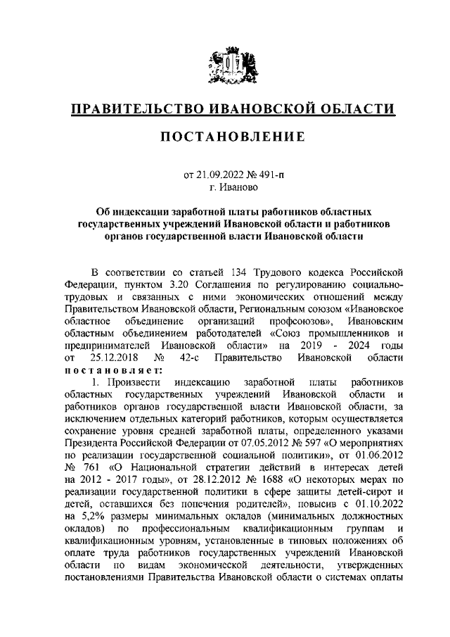 Постановление Правительства Ивановской области от 21.09.2022 N 491-п "Об индексации заработной платы работников областных государственных учреждений Ивановской области и работников органов государственной власти Ивановской области"
