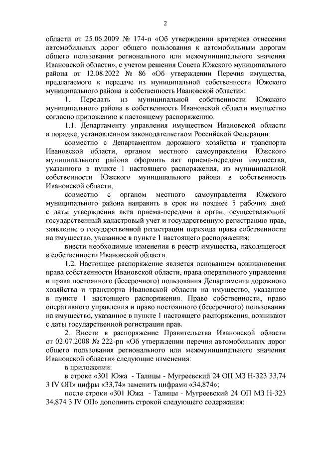 Распоряжение Правительства Ивановской области от 21.09.2022 N 113-рп "О передаче автомобильной дороги из муниципальной собственности Южского муниципального района в собственность Ивановской области и о внесении изменений в распоряжение Правительства Ивановской области от 02.07.2008 N 222-рп "Об утверждении перечня автомобильных дорог общего пользования регионального или межмуниципального значения Ивановской области" (вместе с "Перечнем имущества, передаваемого из муниципальной собственности Южского муниципального района в собственность Ивановской области")