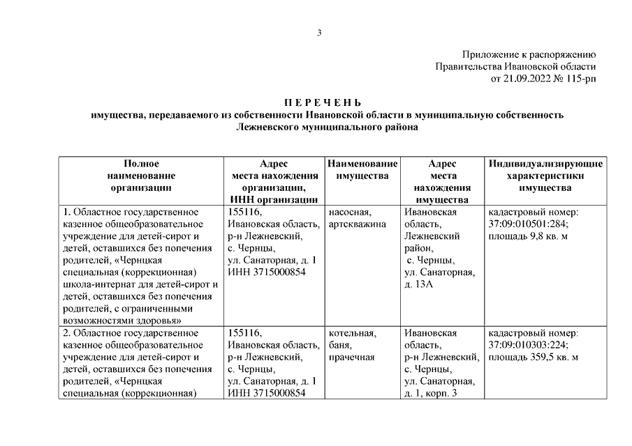 Распоряжение Правительства Ивановской области от 21.09.2022 N 115-рп "О передаче имущества из собственности Ивановской области в муниципальную собственность Лежневского муниципального района"