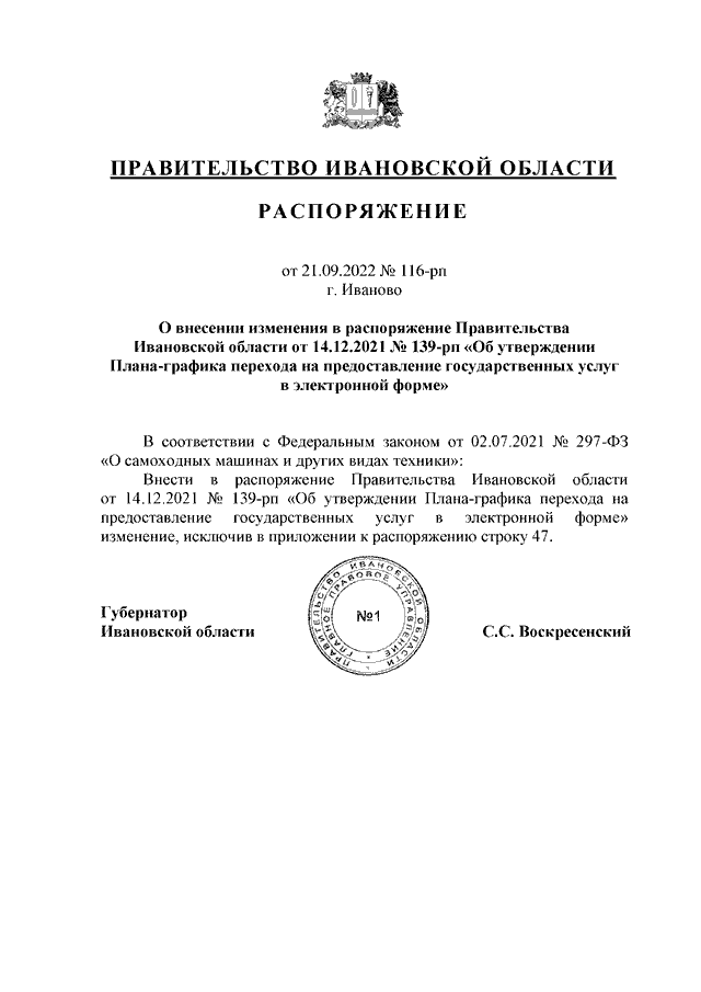 Распоряжение Правительства Ивановской области от 21.09.2022 N 116-рп "О внесении изменения в распоряжение Правительства Ивановской области от 14.12.2021 N 139-рп "Об утверждении Плана-графика перехода на предоставление государственных услуг в электронной форме"