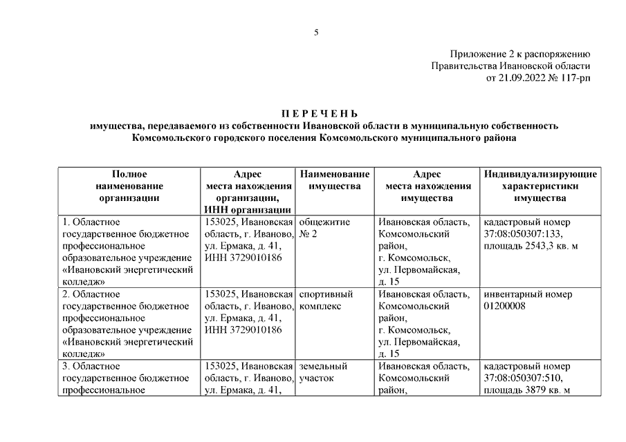 Распоряжение Правительства Ивановской области от 21.09.2022 N 117-рп "О передаче имущества из собственности Ивановской области в муниципальную собственность Комсомольского муниципального района и Комсомольского городского поселения Комсомольского муниципального района"