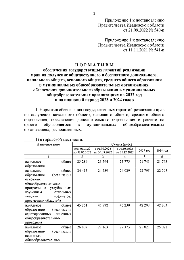 Постановление Правительства Ивановской области от 21.09.2022 N 540-п "О внесении изменений в постановление Правительства Ивановской области от 11.11.2021 N 541-п "Об утверждении нормативов обеспечения государственных гарантий реализации прав на получение общедоступного бесплатного общего образования, обеспечения дополнительного образования в муниципальных образовательных организациях и возмещения затрат на финансовое обеспечение получения общего образования в частных образовательных организациях на 2022 год и на плановый период 2023 и 2024 годов" (вместе с "Нормативами обеспечения государственных гарантий реализации прав на получение общедоступного и бесплатного дошкольного, начального общего, основного общего, среднего общего образования в муниципальных общеобразовательных организациях, обеспечения дополнительного образования в муниципальных общеобразовательных организациях на 2022 год и на плановый период 2023 и 2024 годов", "Нормативами возмещения затрат на финансовое обеспечение получения дошкольного, начального общего, основного общего, среднего общего образования в частных общеобразовательных организациях, осуществляющих образовательную деятельность по имеющим государственную аккредитацию основным общеобразовательным программам, на 2022 год и на плановый период 2023 и 2024 годов", "Нормативами обеспечения государственных гарантий реализации прав на получение общедоступного и бесплатного дошкольного образования в муниципальных дошкольных образовательных организациях на 2022 год и на плановый период 2023 и 2024 годов", "Нормативами возмещения затрат на финансовое обеспечение получения дошкольного образования в частных дошкольных образовательных организациях на 2022 год и на плановый период 2023 и 2024 годов")