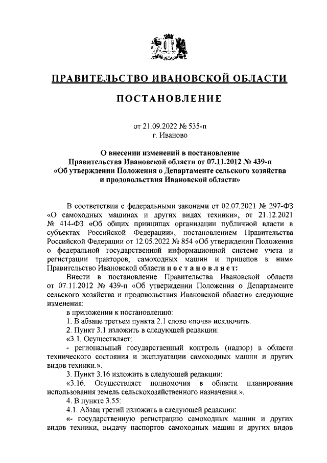 Постановление Правительства Ивановской области от 21.09.2022 N 535-п "О внесении изменений в постановление Правительства Ивановской области от 07.11.2012 N 439-п "Об утверждении Положения о Департаменте сельского хозяйства и продовольствия Ивановской области"