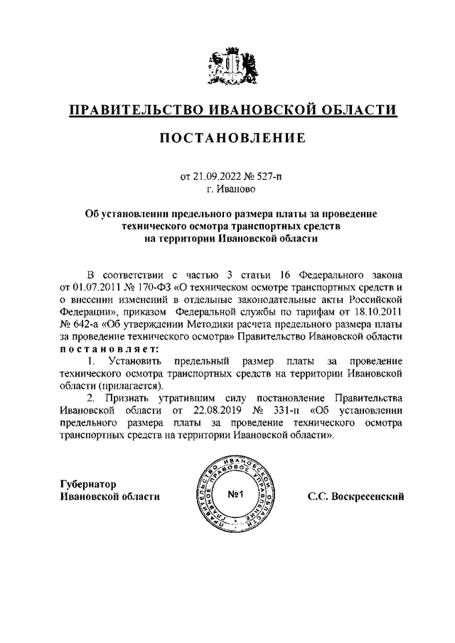 Постановление Правительства Ивановской области от 21.09.2022 N 527-п "Об установлении предельного размера платы за проведение технического осмотра транспортных средств на территории Ивановской области"