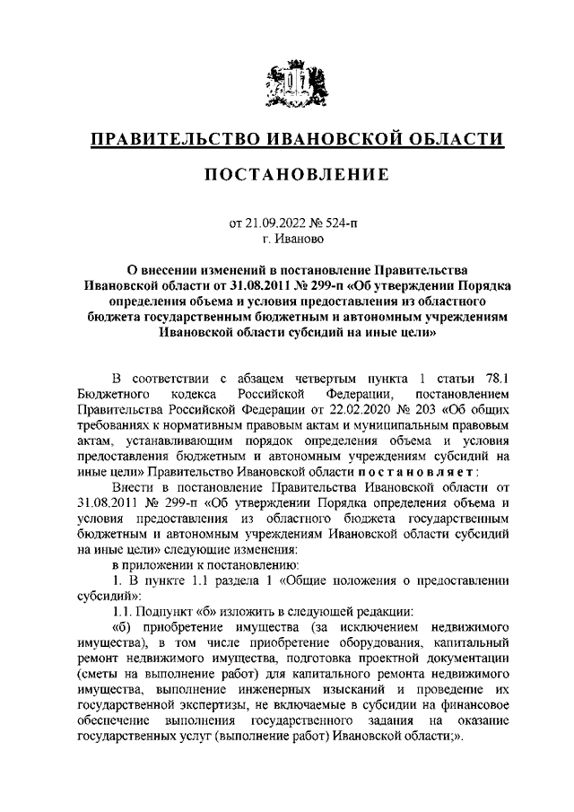 Постановление Правительства Ивановской области от 21.09.2022 N 524-п "О внесении изменений в постановление Правительства Ивановской области от 31.08.2011 N 299-п "Об утверждении Порядка определения объема и условия предоставления из областного бюджета государственным бюджетным и автономным учреждениям Ивановской области субсидий на иные цели"
