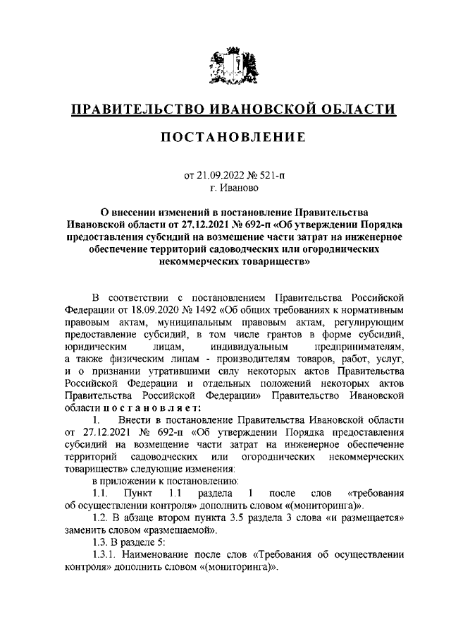 Постановление Правительства Ивановской области от 21.09.2022 N 521-п "О внесении изменений в постановление Правительства Ивановской области от 27.12.2021 N 692-п "Об утверждении Порядка предоставления субсидий на возмещение части затрат на инженерное обеспечение территорий садоводческих или огороднических некоммерческих товариществ"