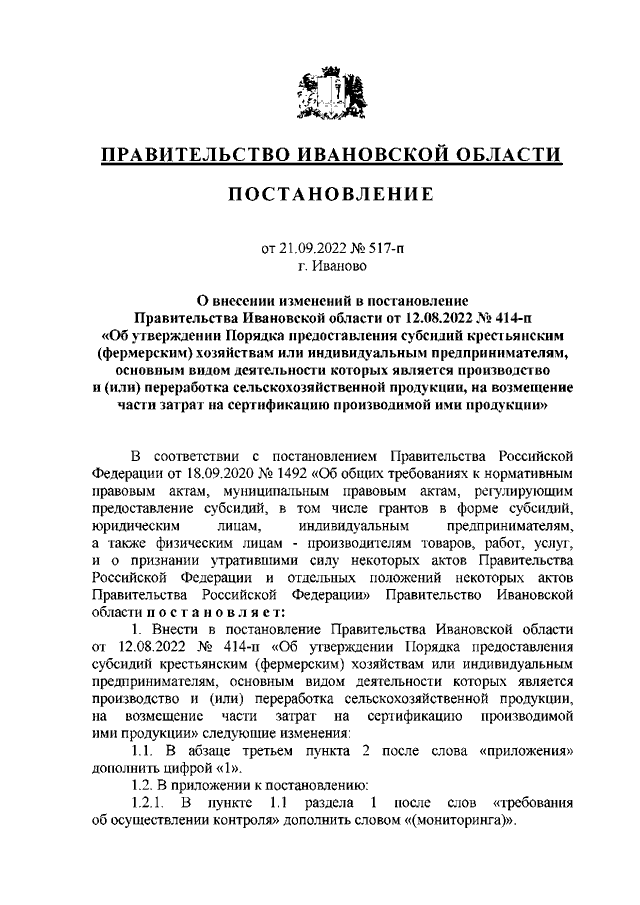Постановление Правительства Ивановской области от 21.09.2022 N 517-п "О внесении изменений в постановление Правительства Ивановской области от 12.08.2022 N 414-п "Об утверждении Порядка предоставления субсидий крестьянским (фермерским) хозяйствам или индивидуальным предпринимателям, основным видом деятельности которых является производство и (или) переработка сельскохозяйственной продукции, на возмещение части затрат на сертификацию производимой ими продукции"