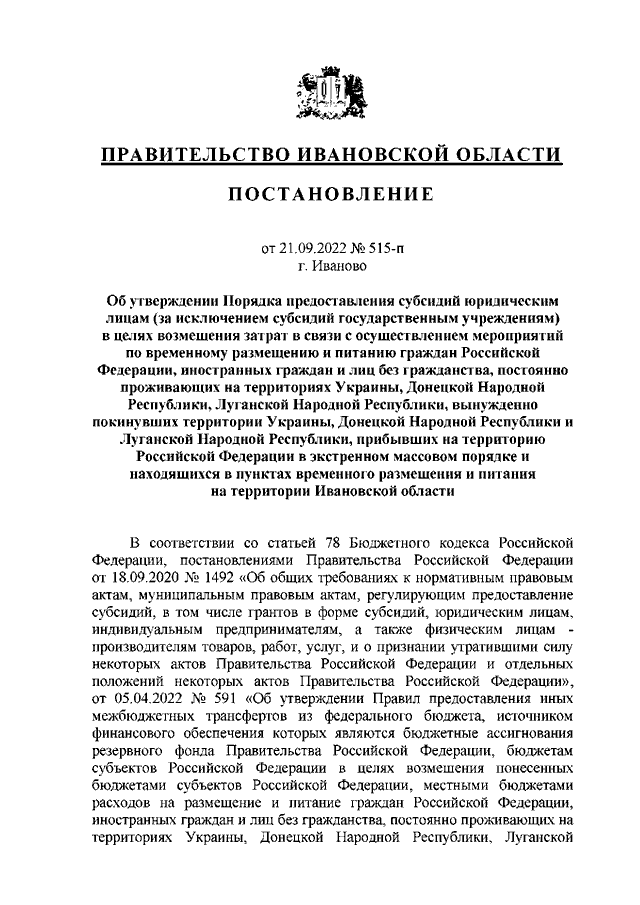 Постановление Правительства Ивановской области от 21.09.2022 N 515-п "Об утверждении Порядка предоставления субсидий юридическим лицам (за исключением субсидий государственным учреждениям) в целях возмещения затрат в связи с осуществлением мероприятий по временному размещению и питанию граждан Российской Федерации, иностранных граждан и лиц без гражданства, постоянно проживающих на территориях Украины, Донецкой Народной Республики, Луганской Народной Республики, вынужденно покинувших территории Украины, Донецкой Народной Республики и Луганской Народной Республики, прибывших на территорию Российской Федерации в экстренном массовом порядке и находящихся в пунктах временного размещения и питания на территории Ивановской области"