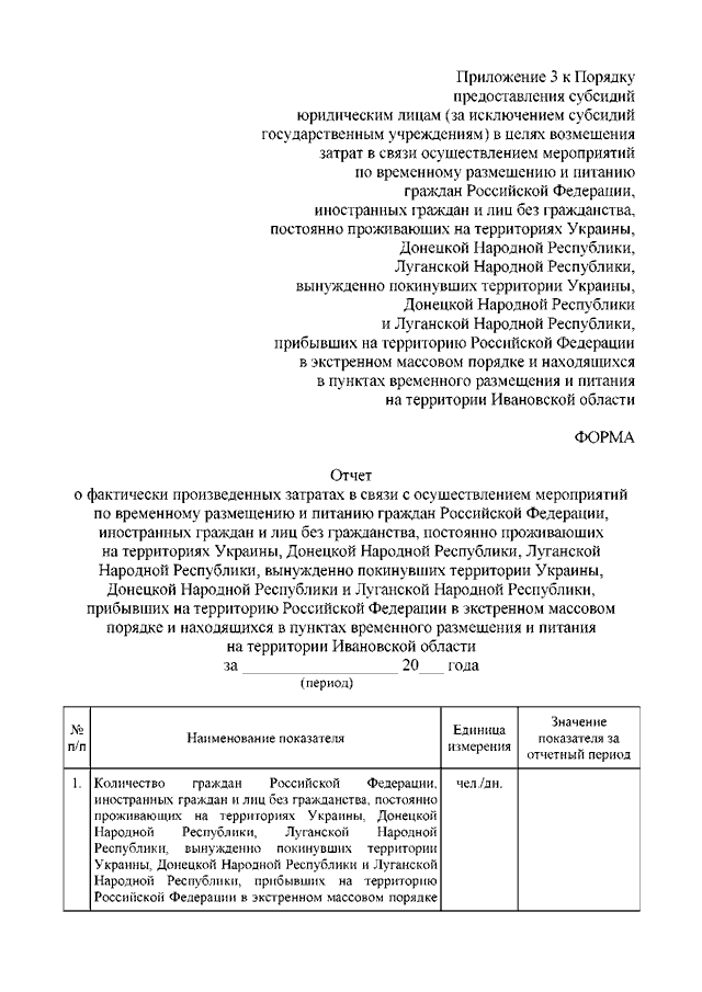 Постановление Правительства Ивановской области от 21.09.2022 N 515-п "Об утверждении Порядка предоставления субсидий юридическим лицам (за исключением субсидий государственным учреждениям) в целях возмещения затрат в связи с осуществлением мероприятий по временному размещению и питанию граждан Российской Федерации, иностранных граждан и лиц без гражданства, постоянно проживающих на территориях Украины, Донецкой Народной Республики, Луганской Народной Республики, вынужденно покинувших территории Украины, Донецкой Народной Республики и Луганской Народной Республики, прибывших на территорию Российской Федерации в экстренном массовом порядке и находящихся в пунктах временного размещения и питания на территории Ивановской области"