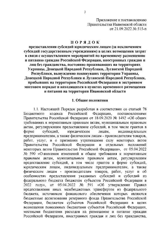 Постановление Правительства Ивановской области от 21.09.2022 N 515-п "Об утверждении Порядка предоставления субсидий юридическим лицам (за исключением субсидий государственным учреждениям) в целях возмещения затрат в связи с осуществлением мероприятий по временному размещению и питанию граждан Российской Федерации, иностранных граждан и лиц без гражданства, постоянно проживающих на территориях Украины, Донецкой Народной Республики, Луганской Народной Республики, вынужденно покинувших территории Украины, Донецкой Народной Республики и Луганской Народной Республики, прибывших на территорию Российской Федерации в экстренном массовом порядке и находящихся в пунктах временного размещения и питания на территории Ивановской области"