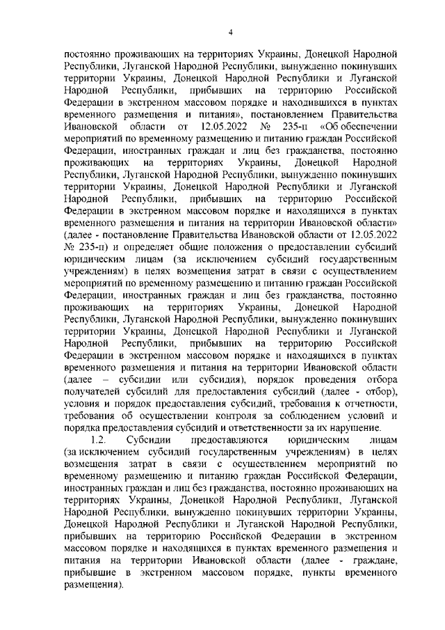 Постановление Правительства Ивановской области от 21.09.2022 N 515-п "Об утверждении Порядка предоставления субсидий юридическим лицам (за исключением субсидий государственным учреждениям) в целях возмещения затрат в связи с осуществлением мероприятий по временному размещению и питанию граждан Российской Федерации, иностранных граждан и лиц без гражданства, постоянно проживающих на территориях Украины, Донецкой Народной Республики, Луганской Народной Республики, вынужденно покинувших территории Украины, Донецкой Народной Республики и Луганской Народной Республики, прибывших на территорию Российской Федерации в экстренном массовом порядке и находящихся в пунктах временного размещения и питания на территории Ивановской области"