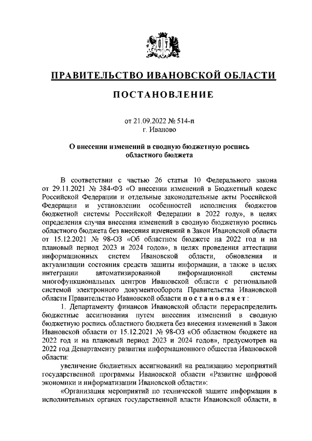 Постановление Правительства Ивановской области от 21.09.2022 N 514-п "О внесении изменений в сводную бюджетную роспись областного бюджета"