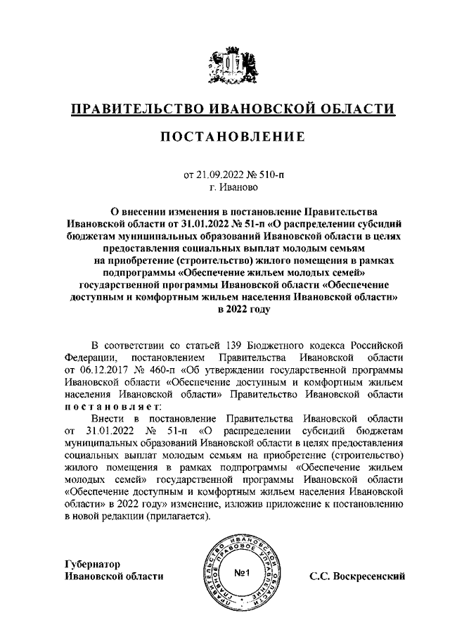Постановление Правительства Ивановской области от 21.09.2022 N 510-п "О внесении изменения в постановление Правительства Ивановской области от 31.01.2022 N 51-п "О распределении субсидий бюджетам муниципальных образований Ивановской области в целях предоставления социальных выплат молодым семьям на приобретение (строительство) жилого помещения в рамках подпрограммы "Обеспечение жильем молодых семей" государственной программы Ивановской области "Обеспечение доступным и комфортным жильем населения Ивановской области" в 2022 году"