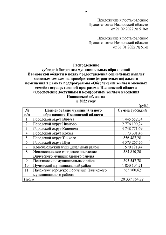 Постановление Правительства Ивановской области от 21.09.2022 N 510-п "О внесении изменения в постановление Правительства Ивановской области от 31.01.2022 N 51-п "О распределении субсидий бюджетам муниципальных образований Ивановской области в целях предоставления социальных выплат молодым семьям на приобретение (строительство) жилого помещения в рамках подпрограммы "Обеспечение жильем молодых семей" государственной программы Ивановской области "Обеспечение доступным и комфортным жильем населения Ивановской области" в 2022 году"