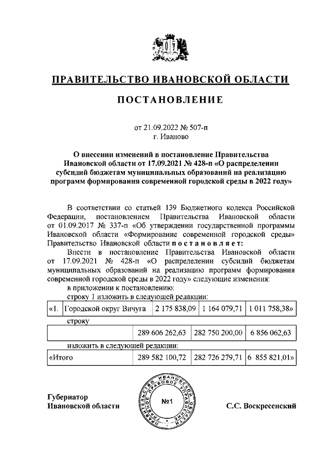 Постановление Правительства Ивановской области от 21.09.2022 N 507-п "О внесении изменений в постановление Правительства Ивановской области от 17.09.2021 N 428-п "О распределении субсидий бюджетам муниципальных образований на реализацию программ формирования современной городской среды в 2022 году"