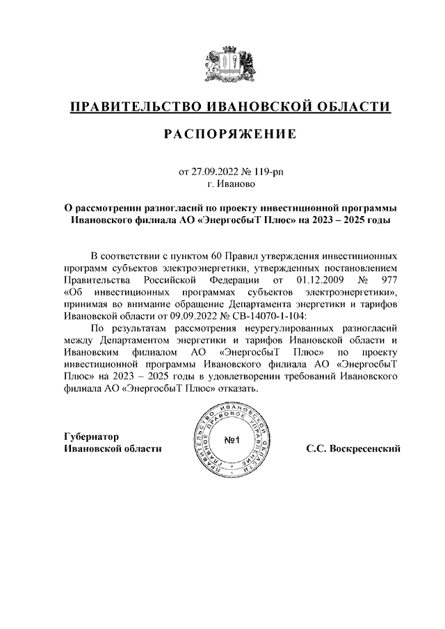 Распоряжение Правительства Ивановской области от 27.09.2022 N 119-рп "О рассмотрении разногласий по проекту инвестиционной программы Ивановского филиала АО "ЭнергосбыТ Плюс" на 2023 - 2025 годы"