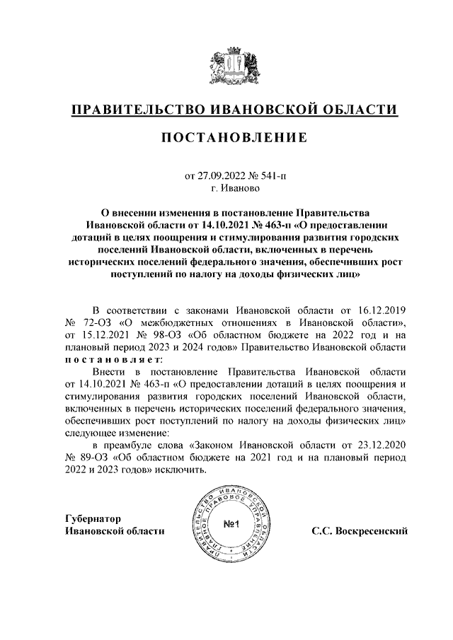 Постановление Правительства Ивановской области от 27.09.2022 N 541-п "О внесении изменения в постановление Правительства Ивановской области от 14.10.2021 N 463-п "О предоставлении дотаций в целях поощрения и стимулирования развития городских поселений Ивановской области, включенных в перечень исторических поселений федерального значения, обеспечивших рост поступлений по налогу на доходы физических лиц"