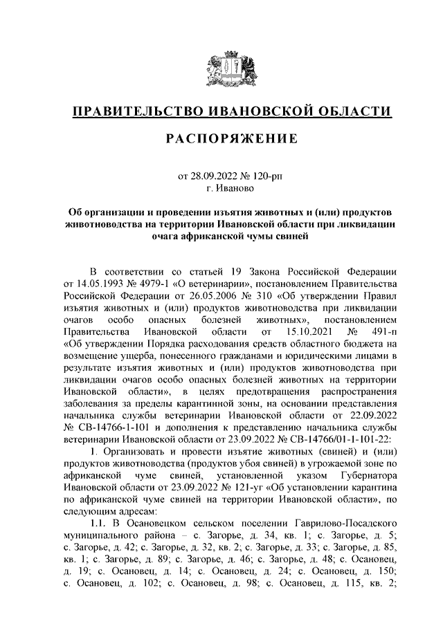 Распоряжение Правительства Ивановской области от 28.09.2022 N 120-рп "Об организации и проведении изъятия животных и (или) продуктов животноводства на территории Ивановской области при ликвидации очага африканской чумы свиней"