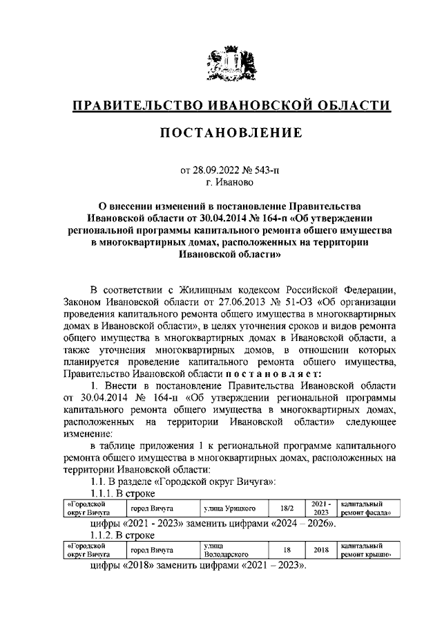 Постановление Правительства Ивановской области от 28.09.2022 N 543-п "О внесении изменений в постановление Правительства Ивановской области от 30.04.2014 N 164-п "Об утверждении региональной программы капитального ремонта общего имущества в многоквартирных домах, расположенных на территории Ивановской области"