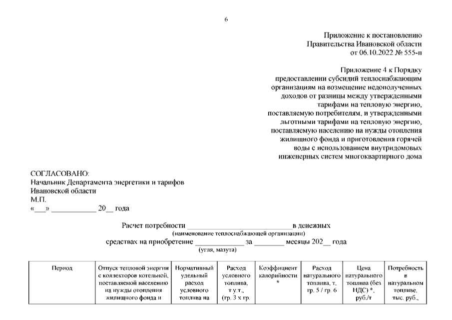 Постановление Правительства Ивановской области от 06.10.2022 N 555-п "О внесении изменений в постановление Правительства Ивановской области от 22.05.2015 N 211-п "О предоставлении субсидий теплоснабжающим организациям на возмещение недополученных доходов от разницы между утвержденными тарифами на тепловую энергию, поставляемую потребителям, и утвержденными льготными тарифами на тепловую энергию, поставляемую населению на нужды отопления жилищного фонда и приготовления горячей воды с использованием внутридомовых инженерных систем многоквартирного дома"