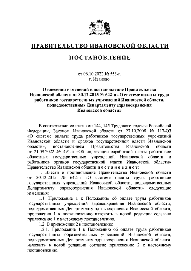 Постановление Правительства Ивановской области от 06.10.2022 N 553-п "О внесении изменений в постановление Правительства Ивановской области от 30.12.2015 N 642-п "О системе оплаты труда работников государственных учреждений Ивановской области, подведомственных Департаменту здравоохранения Ивановской области"