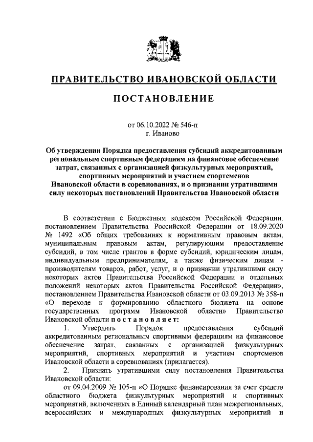 Постановление Правительства Ивановской области от 06.10.2022 N 546-п "Об утверждении Порядка предоставления субсидий аккредитованным региональным спортивным федерациям на финансовое обеспечение затрат, связанных с организацией физкультурных мероприятий, спортивных мероприятий и участием спортсменов Ивановской области в соревнованиях, и о признании утратившими силу некоторых постановлений Правительства Ивановской области"
