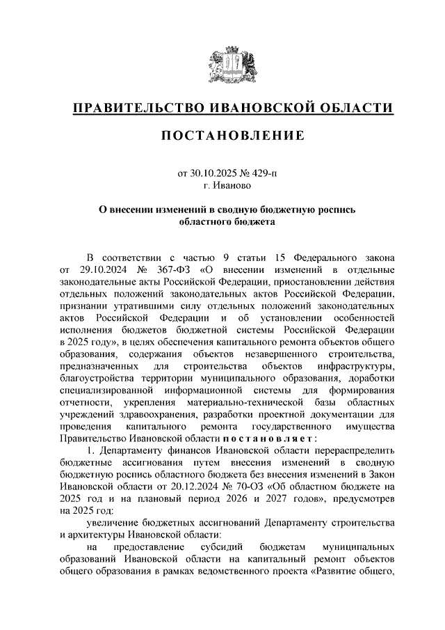 Постановление Правительства Ивановской области от 30.10.2025 N 429-п "О внесении изменений в сводную бюджетную роспись областного бюджета"