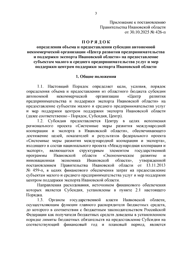 Постановление Правительства Ивановской области от 30.10.2025 N 426-п "Об утверждении Порядка определения объема и предоставления субсидии автономной некоммерческой организации "Центр развития предпринимательства и поддержки экспорта Ивановской области" на предоставление субъектам малого и среднего предпринимательства услуг и мер поддержки центром поддержки экспорта Ивановской области"