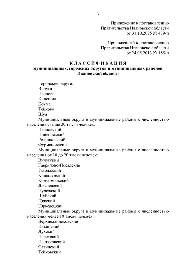Постановление Правительства Ивановской области от 31.10.2025 N 439-п "О внесении изменений в постановление Правительства Ивановской области от 24.05.2013 N 185-п "Об оценке эффективности деятельности органов местного самоуправления городских округов и муниципальных районов Ивановской области" (вместе с "Классификацией муниципальных, городских округов и муниципальных районов Ивановской области")