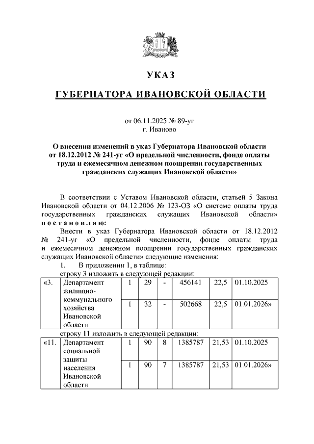 Указ Губернатора Ивановской области от 06.11.2025 N 89-уг "О внесении изменений в указ Губернатора Ивановской области от 18.12.2012 N 241-уг "О предельной численности, фонде оплаты труда и ежемесячном денежном поощрении государственных гражданских служащих Ивановской области"