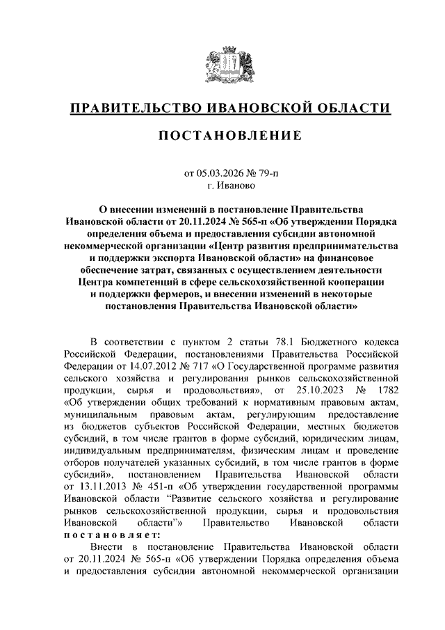 Постановление Правительства Ивановской области от 05.03.2026 N 79-п "О внесении изменений в постановление Правительства Ивановской области от 20.11.2024 N 565-п "Об утверждении Порядка определения объема и предоставления субсидии автономной некоммерческой организации "Центр развития предпринимательства и поддержки экспорта Ивановской области" на финансовое обеспечение затрат, связанных с осуществлением деятельности Центра компетенций в сфере сельскохозяйственной кооперации и поддержки фермеров, и внесении изменений в некоторые постановления Правительства Ивановской области"